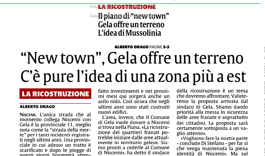 L'amministrazione comunale di Gela è vicina in maniera fattiva e non solo formale verso la popolazione di Niscemi colpita dall’evento franoso. Ieri il sindaco Terenziano Di Stefano e l'assessore Valeria Caci hanno partecipato al tavolo del centro operativo, in municipio a Niscemi, coordinato dal Prefetto di Caltanissetta. Due le proposte messe in campo. Nell’ambito del distretto socio-sanitario (di cui anche Niscemi fa parte) è stata data disponibilità per il trasporto dei disabili niscemesi nei centri di riabilitazione di Gela. Per gli sfollati è stata data disponibilità degli immobili confiscati alla mafia nell’immediato mentre per la ricostruzione il Sindaco si è detto pronto a cedere aree a ridosso tra Gela e Niscemi.