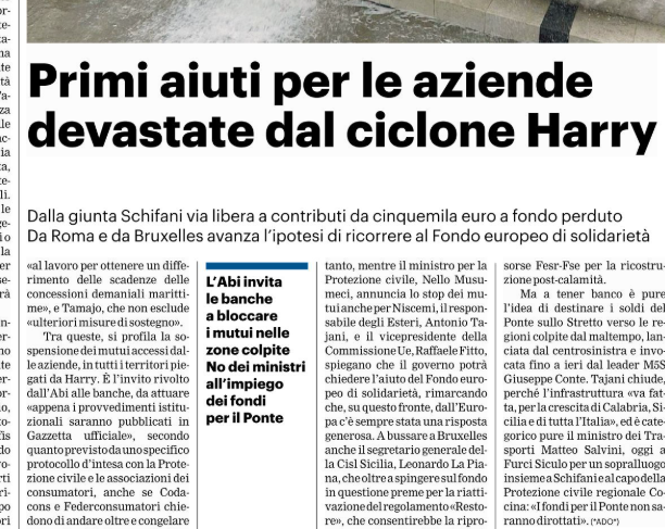 Il governo guidato da Renato Schifani ha stanziato una misura immediata che prevede un contributo minimo di 5 mila euro a fondo perduto per consentire la riattivazione delle attività economiche costrette a fermarsi a causa delle mareggiate e dei danni provocati dal ciclone Harry. Si tratta della prima fase di un piano di sostegno più ampio, che sarà rafforzato nelle prossime settimane.