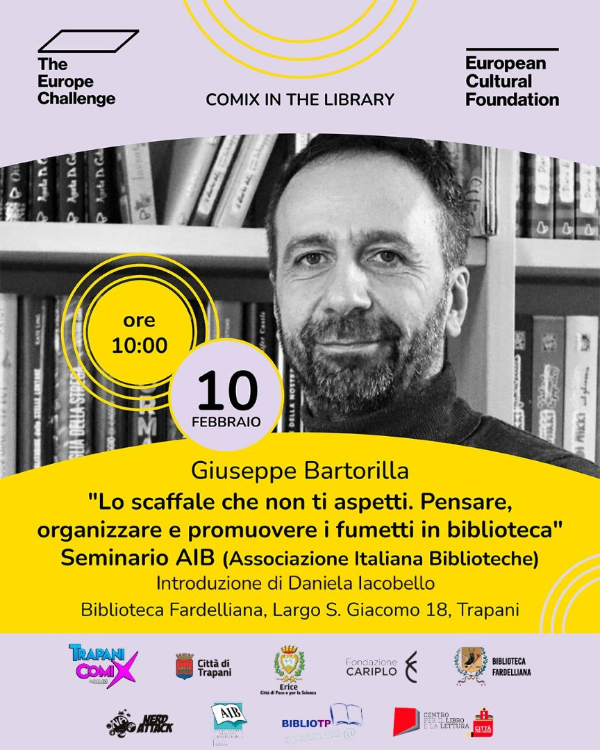 Il secondo appuntamento, il 10 febbraio alle 10.00, è il seminario “Lo scaffale che non ti aspetti. Pensare, organizzare e promuovere i fumetti in biblioteca”, promosso in collaborazione con l’Associazione Italiana Biblioteche e la Rete delle Biblioteche della Provincia di Trapani (BiblioTp). Questo incontro, rivolto a bibliotecari, insegnanti e operatori culturali, approfondirà le strategie per selezionare, organizzare e promuovere i fumetti nelle biblioteche come strumento di ampliamento del pubblico dei lettori.