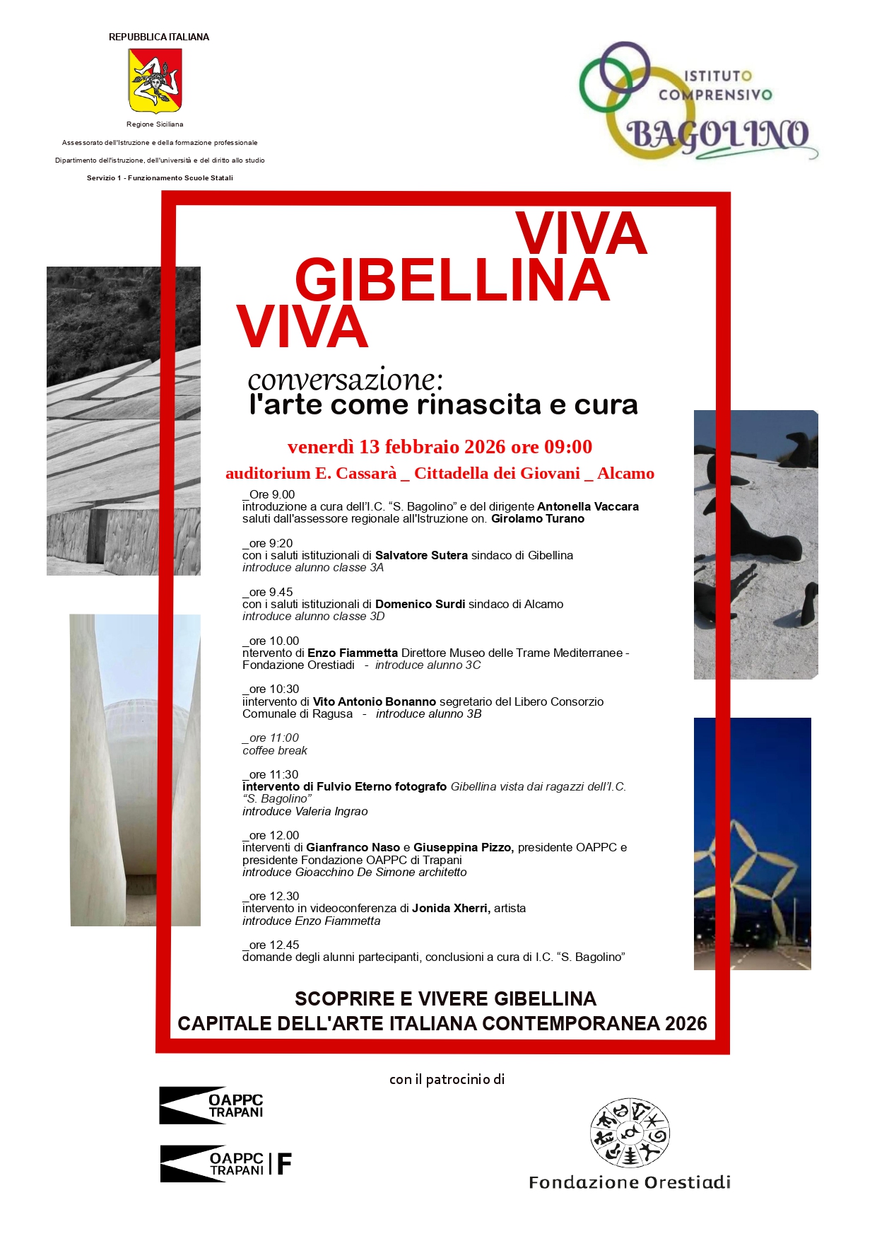 La conversazione rientra nel progetto “Viva Gibellina Viva – Scoprire e vivere Gibellina, Capitale italiana dell’arte contemporanea”, organizzato dall’I.C. “S. Bagolino” di Alcamo. Il percorso, avviato a gennaio e in programma fino a maggio, prevede visite guidate a Gibellina, workshop e laboratori didattici e artistici, lezioni sull’arte e l’architettura contemporanea e momenti di confronto.