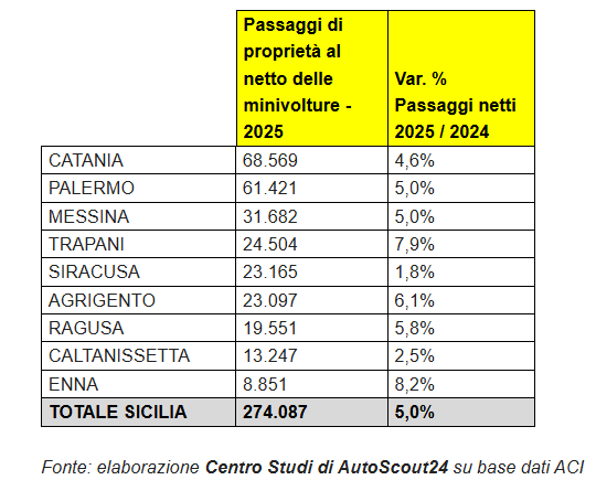 Nel 2025 il mercato delle auto usate continua a crescere in Sicilia e Trapani si conferma tra le province più dinamiche dell’Isola. Secondo i dati dell’Osservatorio AutoScout24 su fonte ACI, lo scorso anno nella regione si sono registrati 274.087 passaggi di proprietà netti, con un aumento del 5% rispetto al 2024. Un trend positivo accompagnato, però, da un calo dei prezzi medi delle vetture in vendita, scesi del 3,6% e attestati intorno ai 19.330 euro.