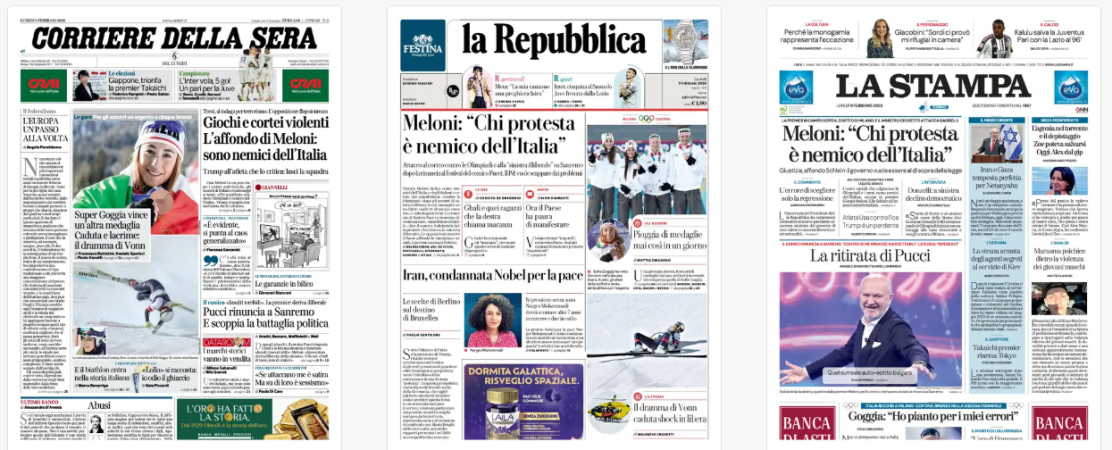 Titoli Corriere della Sera: Giochi e cortei violenti / L’affondo di Meloni: / sono nemici dell’Italia la Repubblica: Meloni: «Chi protesta / è nemico dell’Italia» La Stampa: Meloni: «Chi protesta / è nemico dell’Italia» Il Sole 24 Ore: Immobili e mercati / Dalle città ai centri / minori: quanto / rende l’affitto breve Il Messaggero: Sabotaggi, si indaga per terrorismo Il Giornale: Purghe democratiche Qn: Sicurezza, l’ora del decreto / «Fermeremo i violenti» Il Fatto: «Svolta autoritaria con il decreto / Sicurezza Leggo: «Proteste ai Giochi? Nemici dell’Italia» Libero: Non c’è niente da ridere La Verità: Abbiamo scovato un picchiatore / del poliziotto pestato a Troino Il Mattino: Sabotaggi, la pista terrorismo il Quotidiano del Sud: Riuso&Riciclo, roba da ricchi Domani: Allarmi ignorati, pm e fedelissimi / Niscemi, Musumeci è una frana