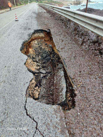 È lo stesso punto che appena dieci giorni fa, durante le mareggiate, era stato invaso da alghe e detriti marini, rendendo l’asfalto scivoloso e poco sicuro. Oggi il problema è ancora più grave: le infiltrazioni d’acqua, favorite dalla pioggia che cade ininterrottamente dalla fine di dicembre, hanno eroso la base della carreggiata fino a provocarne il collasso.