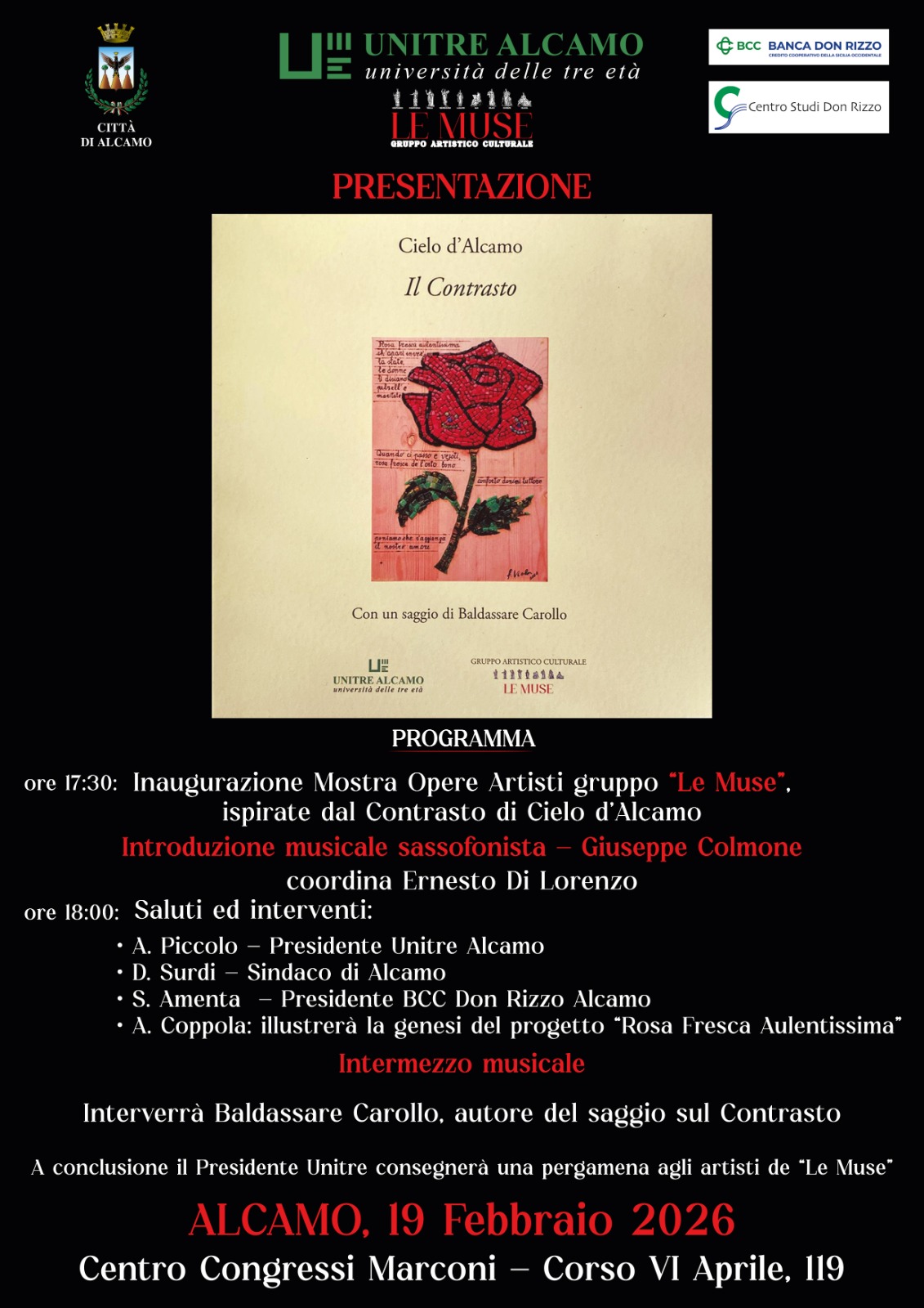 L’iniziativa, promossa dall’Unitre di Alcamo insieme al gruppo artistico “Le Muse”, prenderà il via alle 17.30 con l’inaugurazione di una mostra collettiva ispirata alla “Rosa Fresca Aulentissima”. Le opere esposte reinterpretano in chiave visiva i versi del componimento medievale, tra memoria letteraria e sensibilità contemporanea. L’apertura sarà accompagnata dalle note del sassofonista Giuseppe Colmone. Dalle 18.00 spazio agli interventi istituzionali. Sono annunciati il sindaco Domenico Surdi, il presidente dell’Unitre Nino Piccolo e il presidente della BCC Don Rizzo. Il cuore dell’incontro sarà dedicato al progetto “Rosa Fresca Aulentissima”, illustrato da Antonino Coppola, e alla presentazione del saggio critico di Baldassare Carollo sul Contrasto. A coordinare i lavori sarà il giornalista Ernesto Di Lorenzo. La serata si concluderà con la consegna di pergamene ricordo agli artisti del gruppo “Le Muse”, protagonisti della mostra.