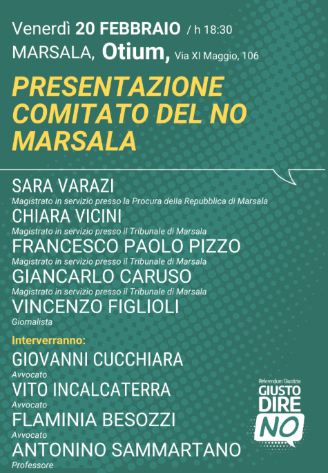 Oggi, venerdì 20 febbraio, presso i locali di Otium (in via XI Maggio 106), verrà presentato il Comitato “Giusto Dire No”, costituito da operatori della giustizia ed esponenti della società civile. L'iniziativa si terrà a partire dalle 18.30.