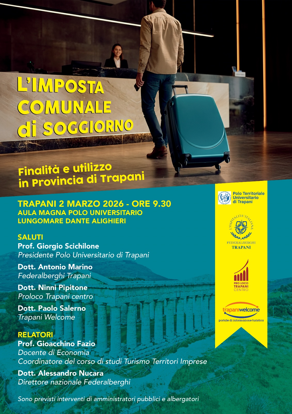 Si terrà lunedì 2 marzo 2026, alle ore 9.30, nell’Aula Magna del Polo Universitario di Trapani, sul Lungomare Dante Alighieri, l’incontro dal titolo “L’Imposta Comunale di Soggiorno: finalità e utilizzo in Provincia di Trapani”.