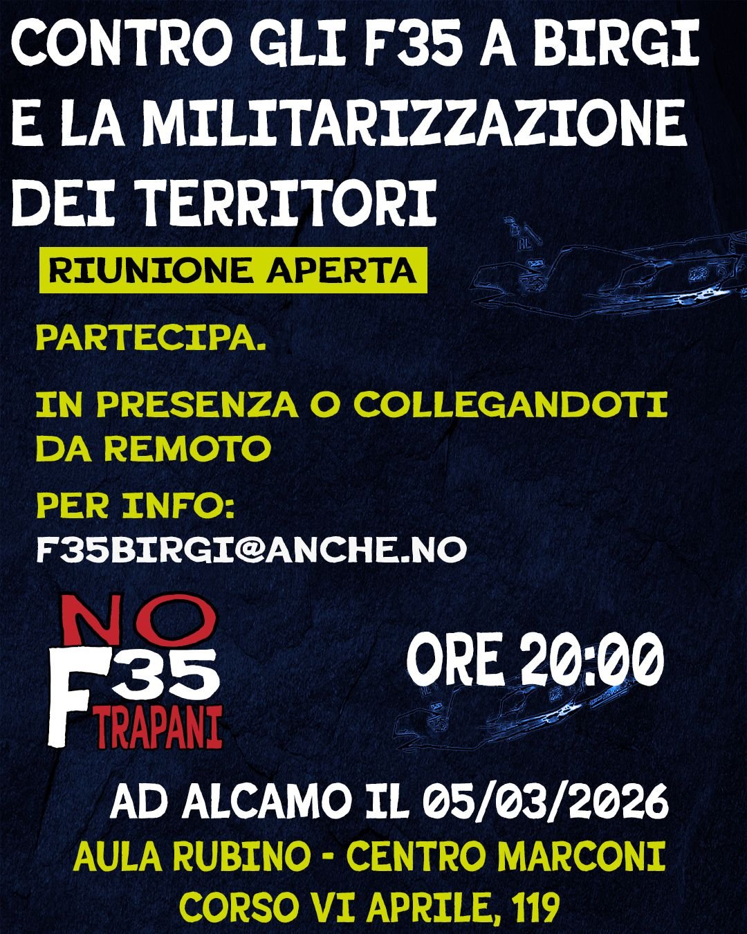 Prosegue la mobilitazione contro gli F-35 e contro l’addestramento a Birgi per il loro utilizzo. Il Comitato No F-35 Trapani-Birgi ha convocato una nuova assemblea pubblica per organizzare le prossime iniziative sul territorio. L’appuntamento è fissato per il 5 marzo, alle ore 20, ad Alcamo, al Centro Marconi (Aula Rubino) in Corso VI Aprile 119.