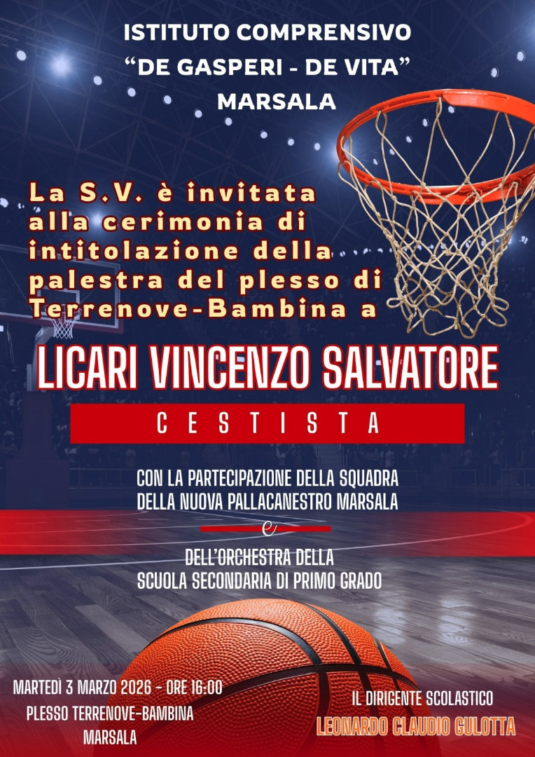 L’Istituto “De Gasperi-De Vita” annuncia la cerimonia ufficiale di intitolazione della palestra del plesso di Terrenove - Bambina di Marsala, a Vincenzo Salvatore Licari, giovane promessa della pallacanestro marsalese, scomparso prematuramente. L’iniziativa nasce dal desiderio di custodire e tramandare la memoria di un giovane che ha rappresentato un esempio di passione per lo sport, entusiasmo, correttezza e senso di appartenenza al territorio, offrendo agli studenti un modello positivo, simbolo di dedizione e impegno. L’evento sarà arricchito dalla partecipazione della Nuova Pallacanestro Marsala e dall’esibizione dell’Orchestra della scuola Secondaria di 1° grado dell’Istituto e dalla presenza di autorità del territorio.