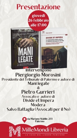 Giovedì 26 febbraio alle ore 17, presso la libreria MilleMondi (via Mariano Stabile 233, Palermo), saranno presentati i volumi “Mani legate” di Piergiorgio Morosini e “Divide et impera” di Pietro Gurrieri.