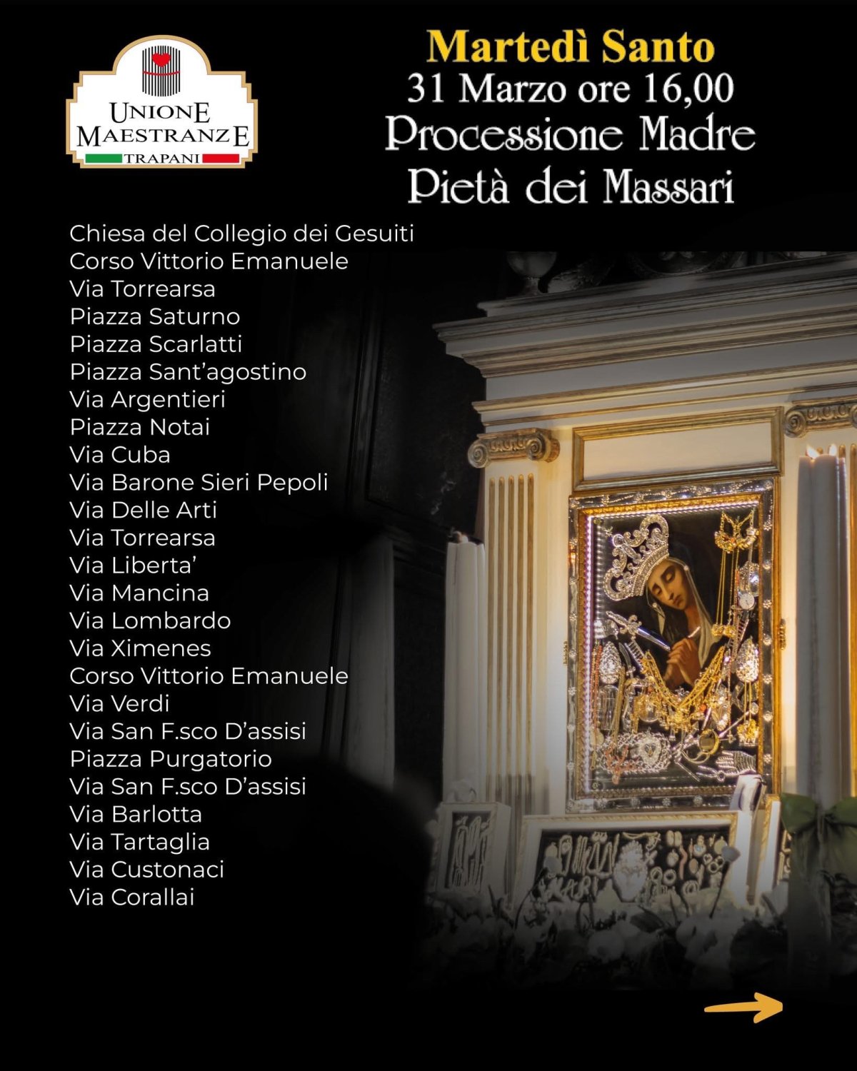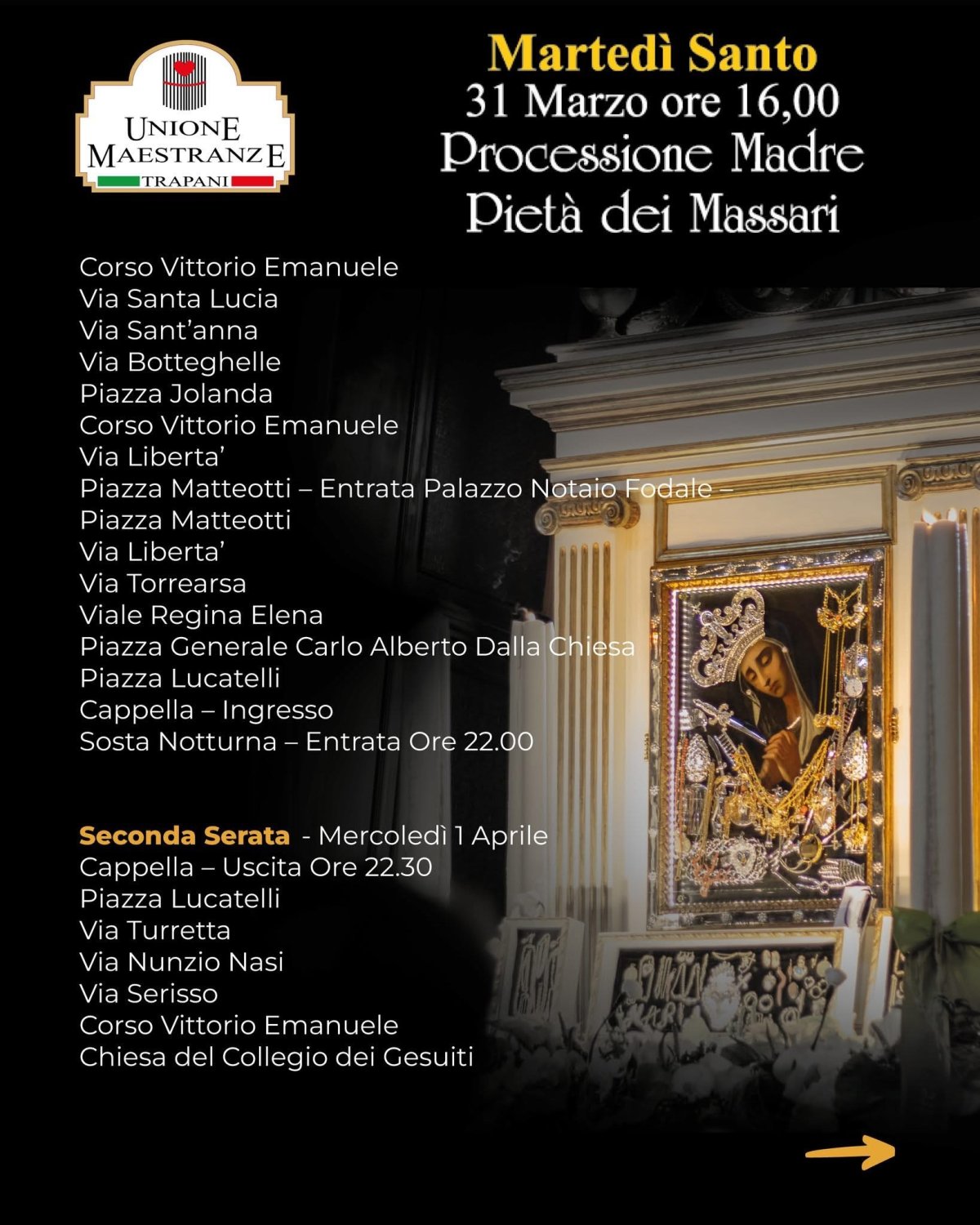 - Martedì Santo (31 marzo, ore 16): Processione della Madre Pietà dei Massari