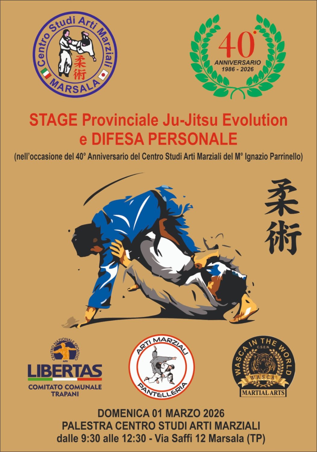 Il “Centro Studi Arti Marziali” di Marsala compie 40 anni e per l'occasione, domenica prossima 1 Marzo, terrà uno stage di jujitsu evolution e difesa personale nella Palestra di via A. Saffi, con inizio alla ore 9:30. Soddisfazione esprime il Maestro Ignazio Parrinello, 8° dan di Jujitsu e direttore Tecnico Nazionale Wasca- Csen- Libertas (comitato comunale TP): “In tutti questi anni di attività si sono distinti tanti giovani con ottimi risultati e, per questo, un ringraziamento particolare lo rivolgo ai genitori, oltre che a tutti i miei allievi, per la loro fiducia. In più, abbiamo aperto nuove palestre in provincia, a dimostrazione della serietà e professionalità del Centro che presiedo. Un bel traguardo questo 40° anniversario, con uno sguardo al futuro pieno di tante novità”.