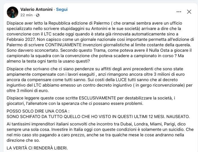 In un post pubblicato sui social, il presidente della F.C. Trapani 1905 attacca l’ex Provincia e sostiene che la convenzione per lo Stadio Provinciale sarebbe stata automaticamente rinnovata fino a febbraio 2027, accusando i giornali di diffondere “invenzioni giornalistiche” e parlando di un clima creato per “destabilizzare la società”.