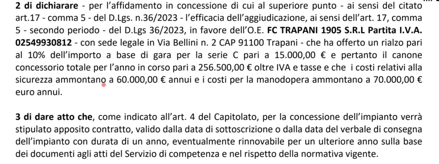 l’aggiudicazione è stata disposta in favore della F.C. Trapani 1905 S.r.l.;