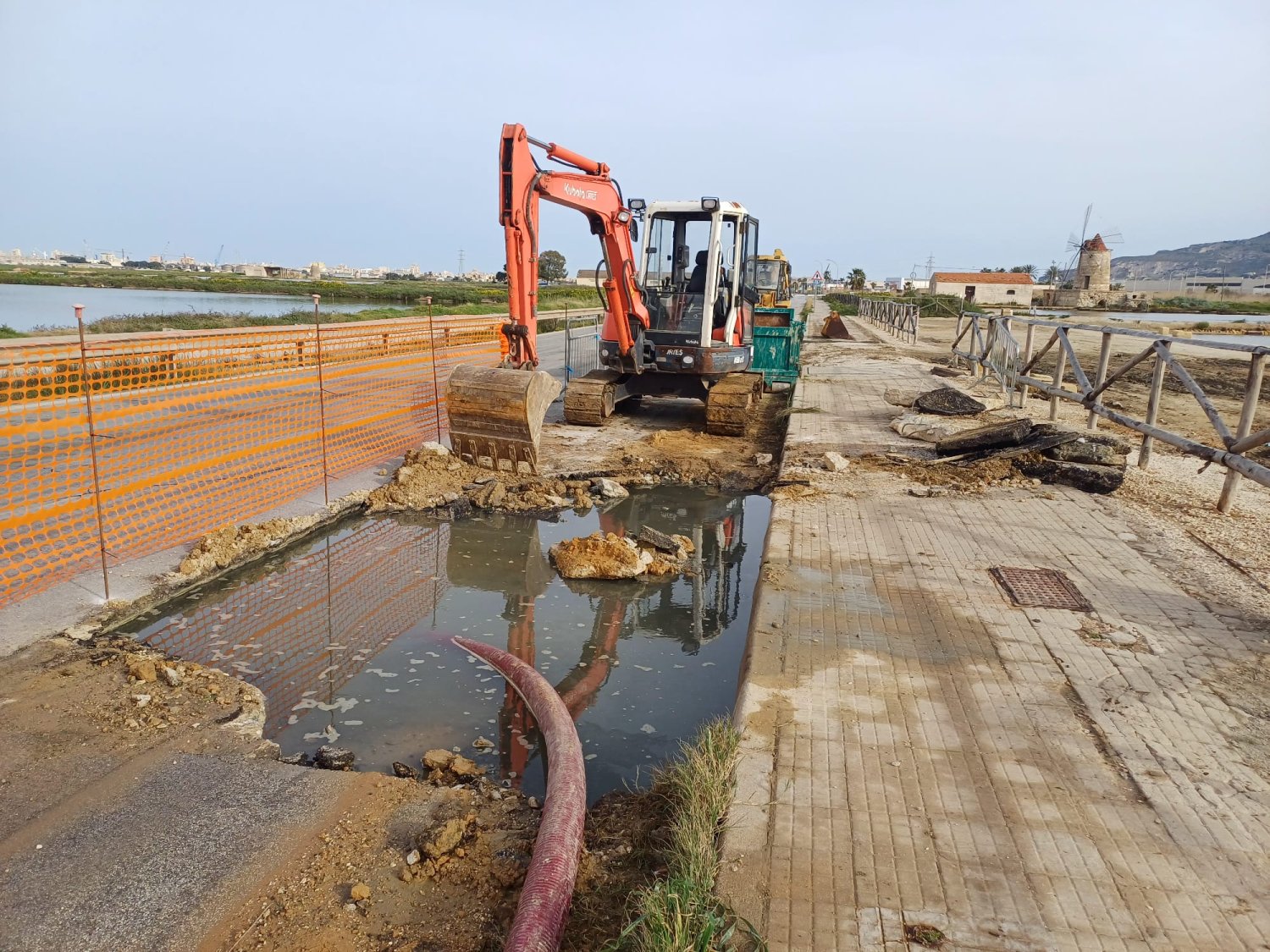 Al via oggi i lavori sulla SP21, all’altezza del Mulino Maria Stella, dove il cedimento della condotta del depuratore ha provocato la fuoriuscita di liquami a pochi metri dalle vasche saline, dentro la Riserva naturale delle Saline di Trapani e Paceco. L’intervento arriva dopo giorni di perdita, mentre sotto l’asfalto si accumulavano acqua e reflui fino al collasso della sede stradale.