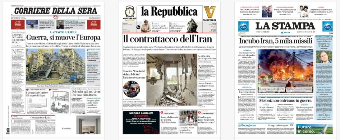 Titoli Corriere della Sera: Guerra, si muove l’Europa la Repubblica: Il contrattacco dell’Iran La Stampa: Incubo Iran, 5mila missili Il Sole 24 Ore: Carburanti, faro sulla speculazione Avvenire: Forza per la pace Il Messaggero: Lo scudo europeo per Cipro Il Giornale: Bollette e benzina / Caccia a chi specula Leggo: «Non entreremo in guerra» Qn: Meloni frena sulle basi Usa / «Non entriamo in guerra» Il Fatto: Armiamoli / e scappiamo Libero: La sinistra si auto-affonda La Verità: I giudici premiano persino / il clandestino stupratore Il Mattino: Guerra in Iran, carburanti alle stelle il Quotidiano del Sud: Meloni: non siamo in guerra il manifesto: La striscia / di Beirut Domani: Israele attacca, è fuga da Beirut / Meloni senza linea sulla guerra