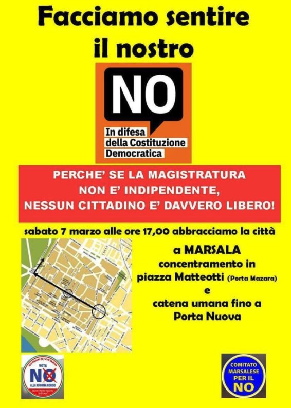 Nel territorio marsalese l’iniziativa prenderà la forma di una catena umana che collegherà piazza Matteotti a piazza della Vittoria (Porta Nuova). L’appuntamento rientra in un calendario di iniziative coordinate in diverse città italiane. All’evento parteciperanno infatti, in collegamento simbolico, anche i comitati per il No di Brescia, Mantova, Palermo, Marsala, Paceco, Lago di Garda, Termini Imerese e San Giuseppe Jato, oltre ad altre piazze che stanno aderendo nelle ultime ore.