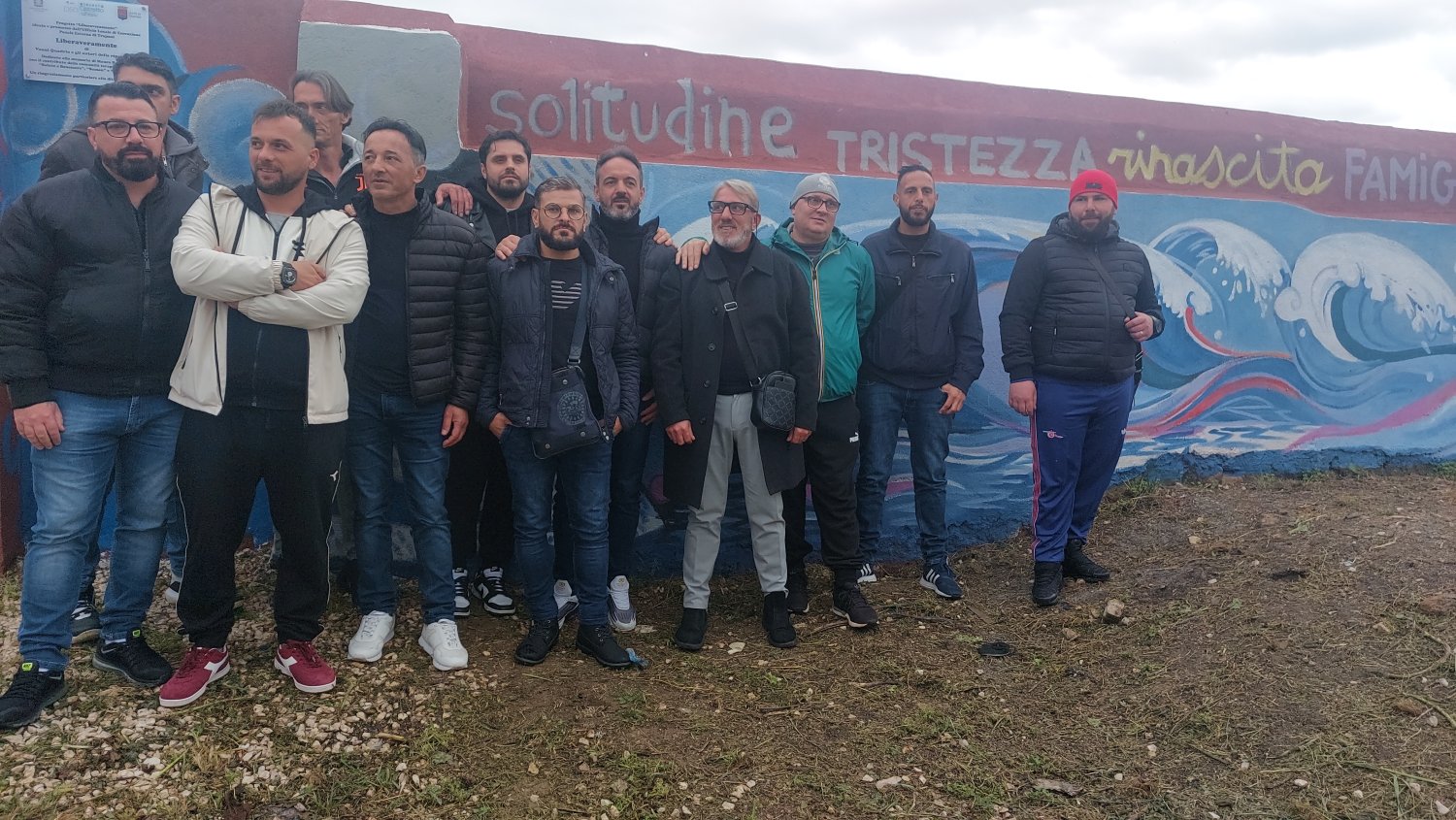 Il murale racconta infatti un percorso umano: le onde del mare, le parole scritte in alto – solitudine, tristezza, rinascita, famiglia, libertà, chiedi aiuto, amore – e i simboli che attraversano la parete parlano di caduta e di rinascita.