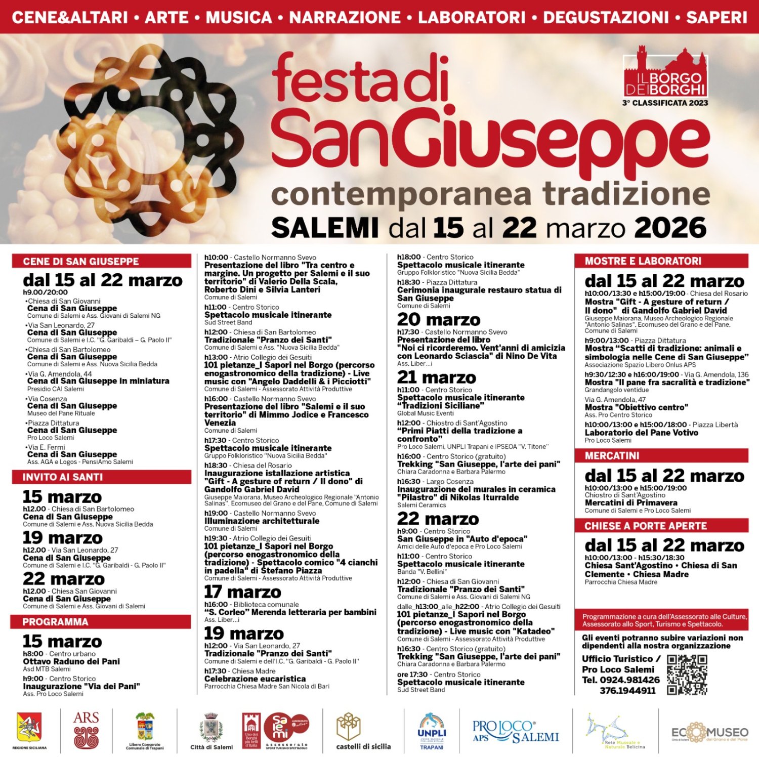 «Manteniamo fede alle aspettative con un programma legato alla tradizione ma arricchito da iniziative culturali e dalla possibilità di visitare alcune tra le chiese più belle del nostro centro storico – dichiarano il sindaco Scalisi e l’assessore Crimi –. Salemi e la Festa di San Giuseppe intendono accogliere al meglio turisti e visitatori che vogliono vivere l’atmosfera di un evento che, con i suoi colori e i suoi profumi, segna il passaggio alla primavera».