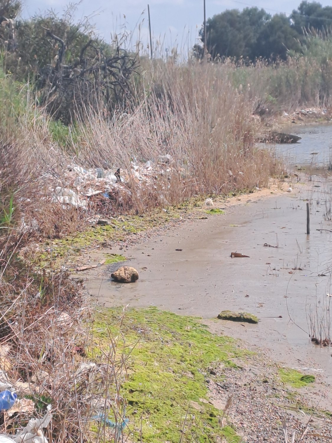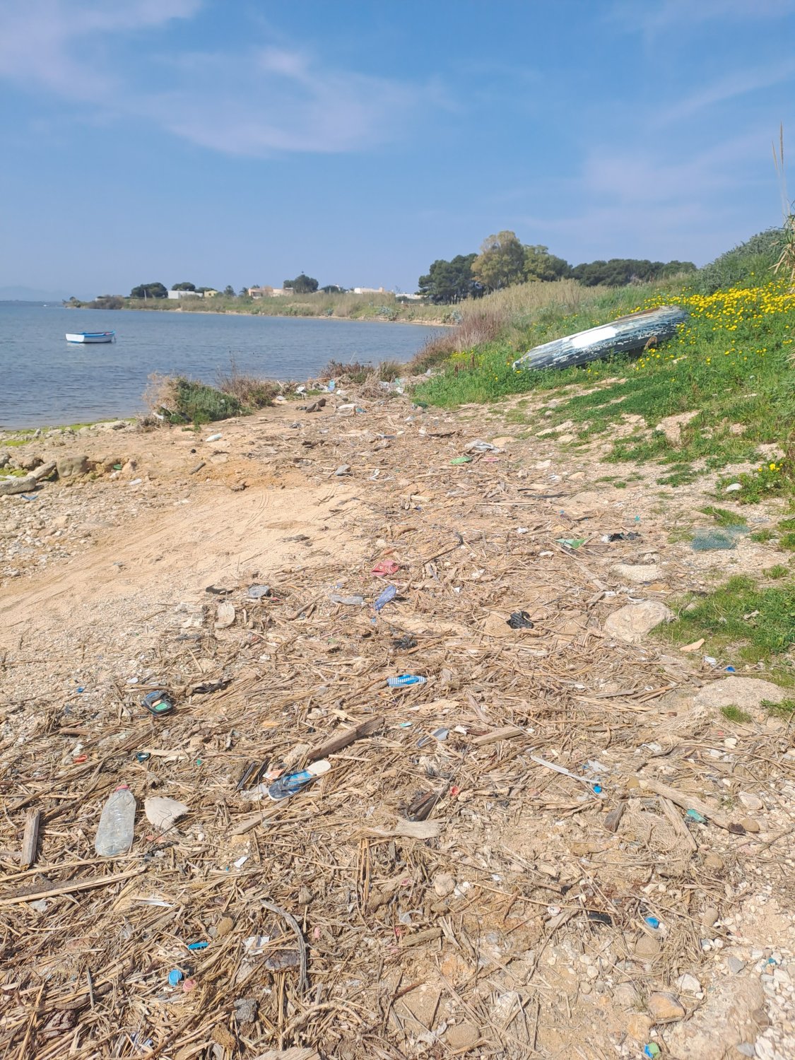 Le foto che accompagnano questo articolo mostrano cumuli di plastica, bottiglie, sacchetti, legni e rifiuti accumulati tra le canne e sulla battigia. In alcuni scatti si vedono tratti di spiaggia coperti da detriti e sporcizia, mentre nei pressi dell’acqua, accanto a piccole imbarcazioni ormeggiate, si notano rifiuti sparsi e vegetazione incolta. Un contrasto evidente tra il paesaggio naturale e lo stato di abbandono.