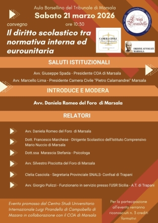 Si terrà sabato 21 marzo 2026 alle ore 10.30, nell’aula Borsellino del Tribunale di Marsala, il convegno dal titolo “Il diritto scolastico tra normativa interna ed eurounitaria”, un appuntamento dedicato all’analisi delle trasformazioni del sistema d’istruzione italiano alla luce delle normative europee.