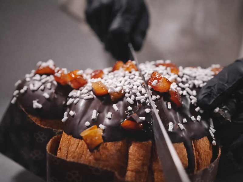 La differenza sta nell'impasto. Alla Pasticceria Savoia la colomba nasce con il lievito madre e segue la stessa lavorazione del panettone: tempi lunghi, nessuna scorciatoia, ingredienti scelti uno per uno. Il risultato è un impasto che profuma, che si conserva nel tempo e che ha quella leggerezza — quasi paradossale per un lievitato ricco — che si sente già al primo morso.