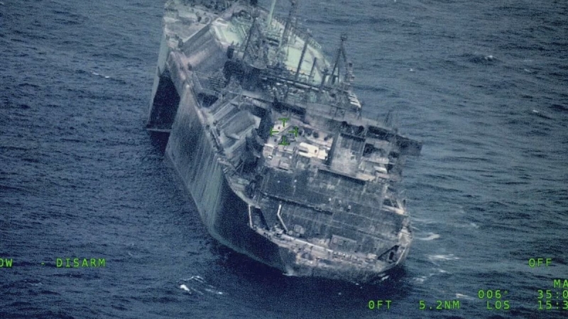 Non è un’esagerazione. Le immagini e le ricostruzioni parlano di una nave gravemente danneggiata, inclinata, con segni evidenti di un vasto incendio che ha coinvolto anche la zona di comando. A bordo restano centinaia di tonnellate di carburante e gas.