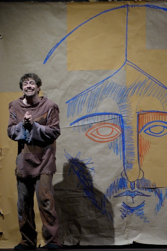 O la scenografia, disegnata dallo stesso Scifoni durante la sua performance, che riprende il ritratto umanissimo del Santo dipinto da Bonaventura Berlinghieri nel 1235 - oggi conservata nella chiesa francescana di Pescia – sulla descrizione realistica di Tommaso da Celano.