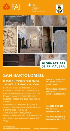 Tornano a Mazara del Vallo le Giornate Fai di Primavera. Sabato 21 e domenica 22 marzo saranno aperte al pubblico, con visite guidate, due ex chiese poco conosciute: San Bartolomeo Apostolo di via Carmine e quella di piazza San Bartolomeo, nei pressi di via Porta Palermo.