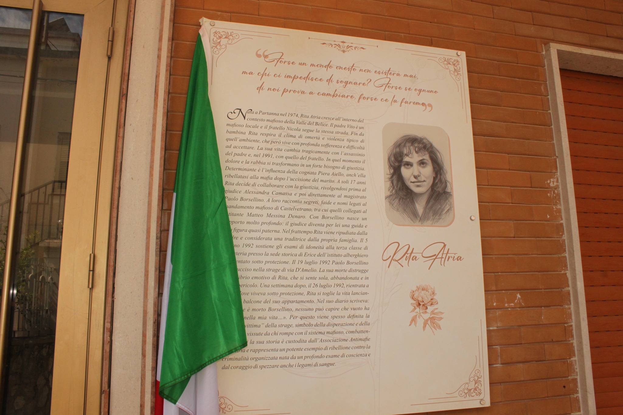 Particolarmente significativa la partecipazione di tanti giovani, tra cui gli studenti dell’istituto “I. e V. Florio” di Erice. La cerimonia si è aperta con l’accompagnamento musicale dell’Associazione Musicale Città di Erice e della Nuova Banda Ericina, quindi con la scopertura del pannello commemorativo all’ingresso del centro, che riporta la biografia e il volto di Rita Atria. All’interno della struttura è stato collocato anche uno dei suoi temi scolastici, testimonianza diretta della sua sensibilità e della sua lucida riflessione sul valore della legalità.