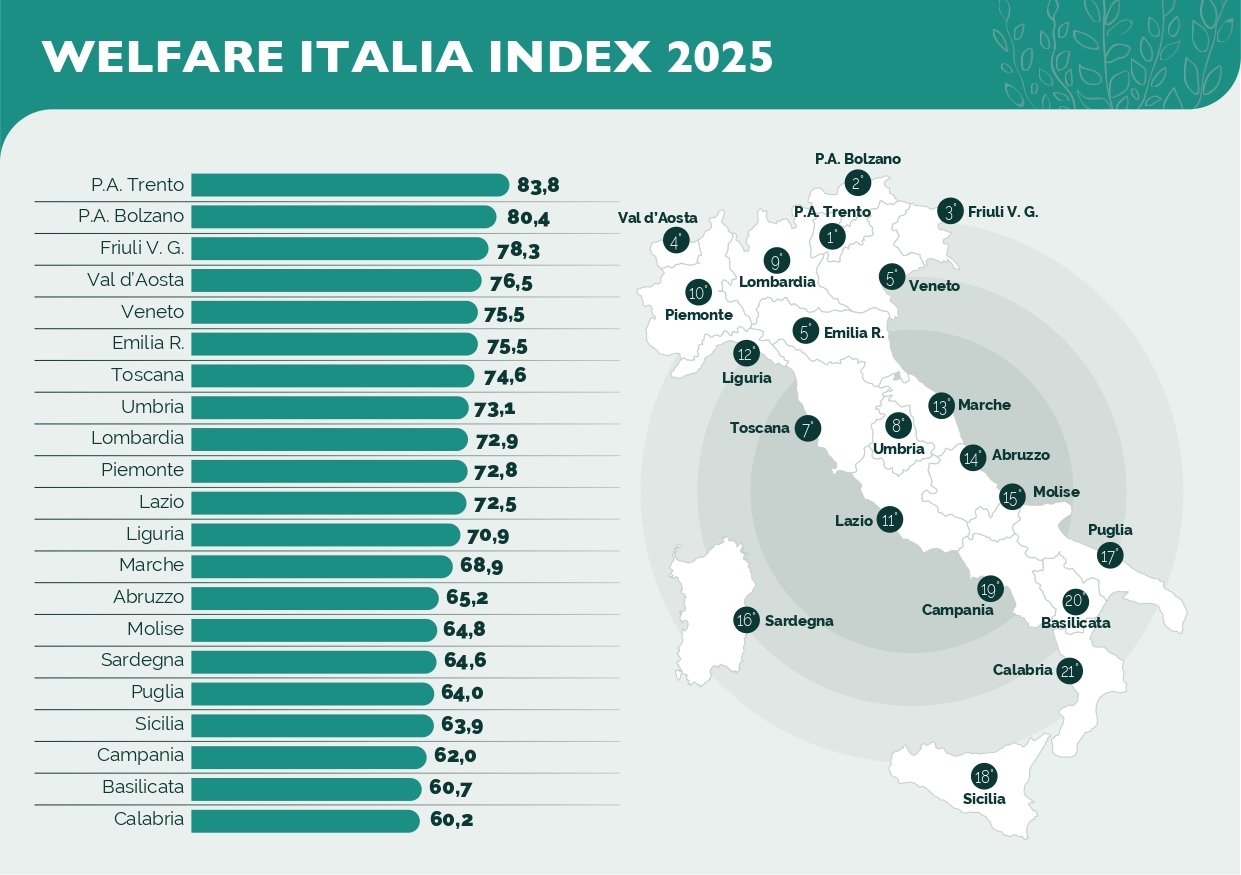 Nel 2025 la Sicilia si è posizionata al 18° posto tra le regioni italiane nella classifica nazionale per efficacia e capacità di risposta del sistema di welfare, secondo quanto emerge dal “Welfare Italia Index 2025”, realizzato dal Think Tank Welfare, Italia, nato su iniziativa del Gruppo Unipol in collaborazione con The European House – Ambrosetti (TEHA). L’indice analizza le politiche sociali, sanitarie, previdenziali e formative, permettendo di individuare punti di forza e aree di criticità per ciascuna regione. Il report completo è disponibile sul sito di Welfare Italia.