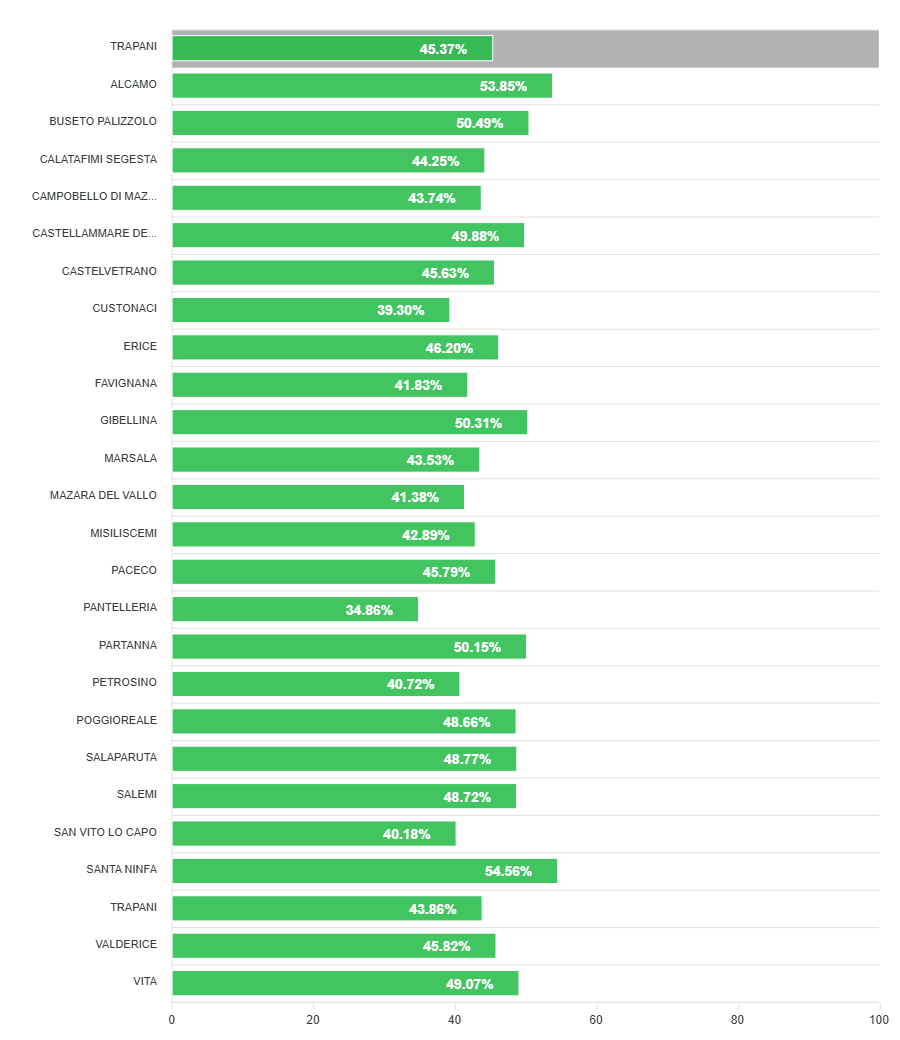 Tra i principali centri si registrano differenze significative. Il dato più alto è quello di Alcamo, dove l’affluenza raggiunge il 53,85%, ben sopra la media provinciale.