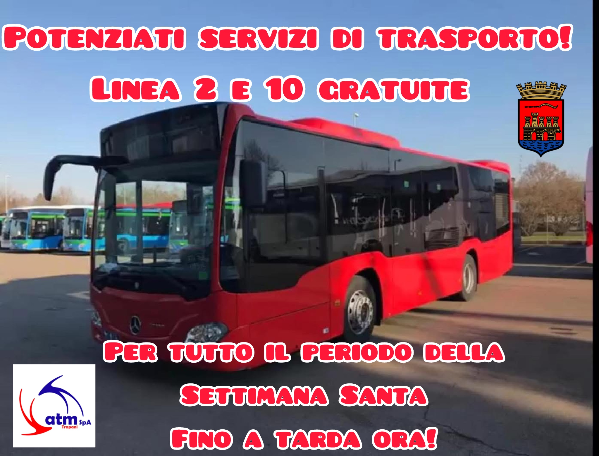 ATM Trapani, in accordo con il Comune, ha rafforzato il servizio urbano delle linee 2 e 10 in occasione della Settimana Santa, con corse fino a tarda notte e un incremento nei giorni di maggiore afflusso.