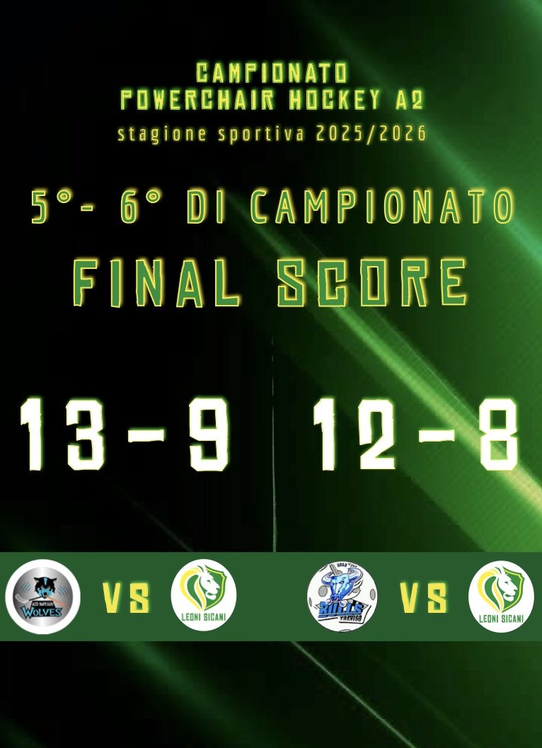 I Leoni Sicani cedono a Bareggio e Treviso dopo due gare giocate a viso aperto. L'11 aprile la grande sfida casalinga contro Udine. Il campionato di Serie A2 di Powerchair Hockey si conferma di altissimo livello e ricco di emozioni. Nel weekend di gare del 21 e 22 marzo, i Leoni Sicani hanno dato vita a due sfide intense e spettacolari contro avversari di grande caratura. Nonostante il massimo impegno e due ottime prestazioni sul fronte offensivo, la formazione giallo-verde ha dovuto cedere il passo ad ASD Bareggio Wolves e Treviso Bulls, due squadre che si sono dimostrate solide, lucide e ben organizzate sul parquet di casa.