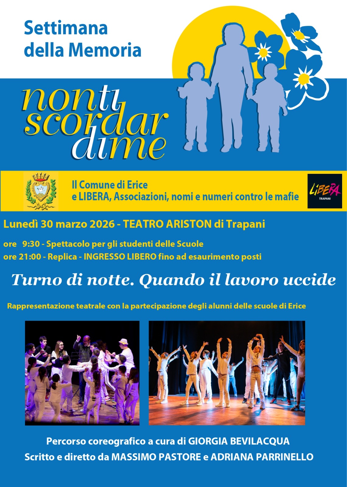 Nell'ambito della Settimana della Memoria del "Non ti scordar di me", il Comune di Erice patrocina lo spettacolo teatrale con la partecipazione degli alunni delle scuole ericine. Scritto e diretto da Massimo Pastore e Adriana Parrinello, percorso scenografico a cura di Giorgia Bevilacqua.