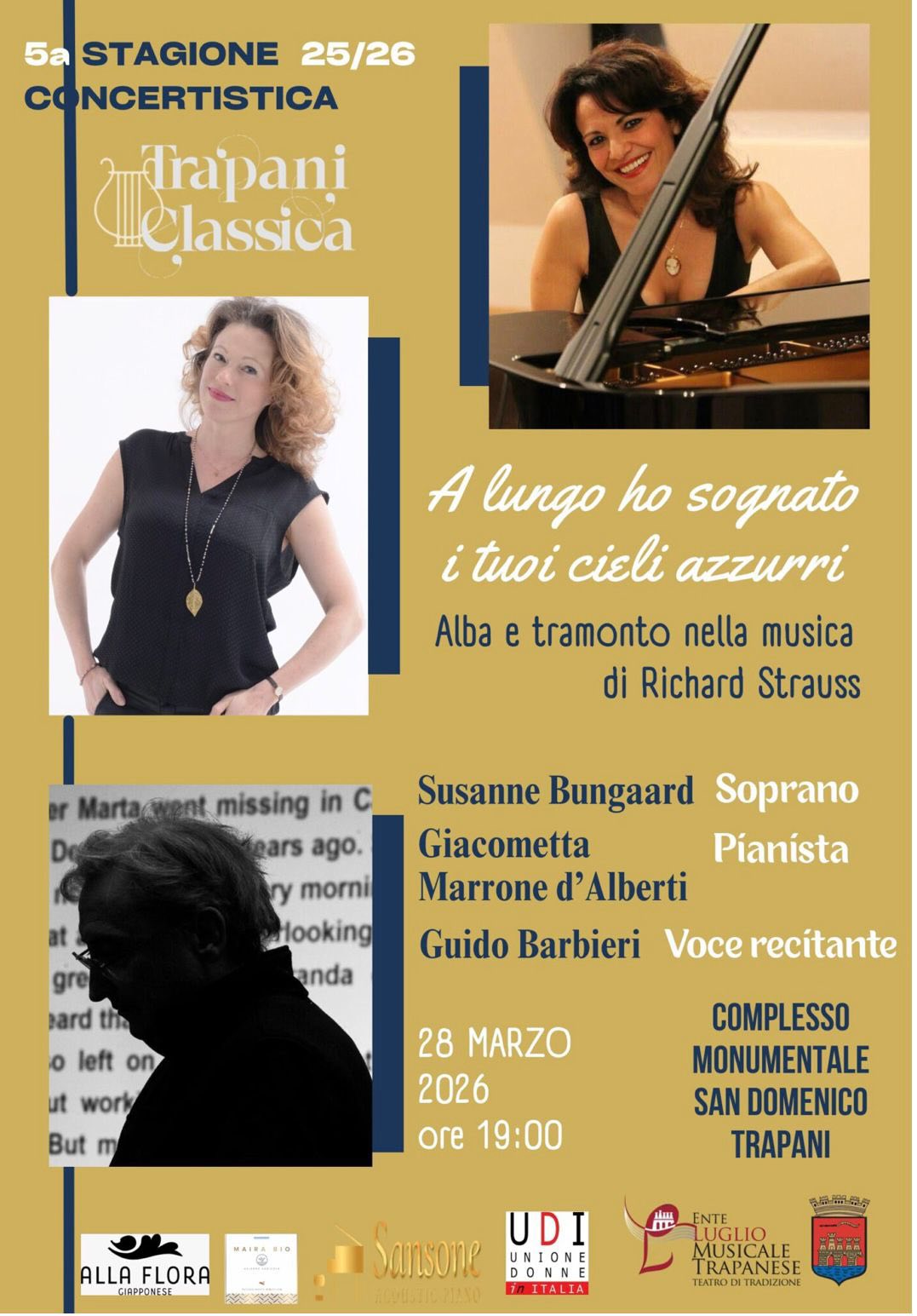 Nell'ambito della stagione concertistica di "Trapani Classica", Concerto per Canto, Pianoforte e voce recitante: di Susanne Bungaard, Giacometta Marrone d'Alberti e Guido Barbieri. In programma brani di R. Strauss, Enoch Arden, Melodramma op.38, Vier Letzte Lieder. In collaborazione con Ente Luglio Musicale e Comune di Trapani.