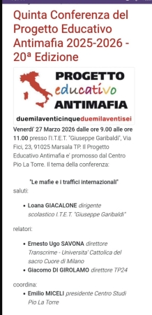 Si terrà, questa mattina, dalle ore 9 alle 11, presso l’I.T.E.T. “Giuseppe Garibaldi” di Marsala, l’ultima conferenza del Progetto educativo antimafia promosso dal Centro Studi Pio La Torre. Il tema scelto per questo appuntamento conclusivo, “Le mafie e i traffici internazionali”, pone al centro dell’attenzione un fenomeno sempre più complesso e globale, che coinvolge non solo l’Italia ma l’intero scenario internazionale.
