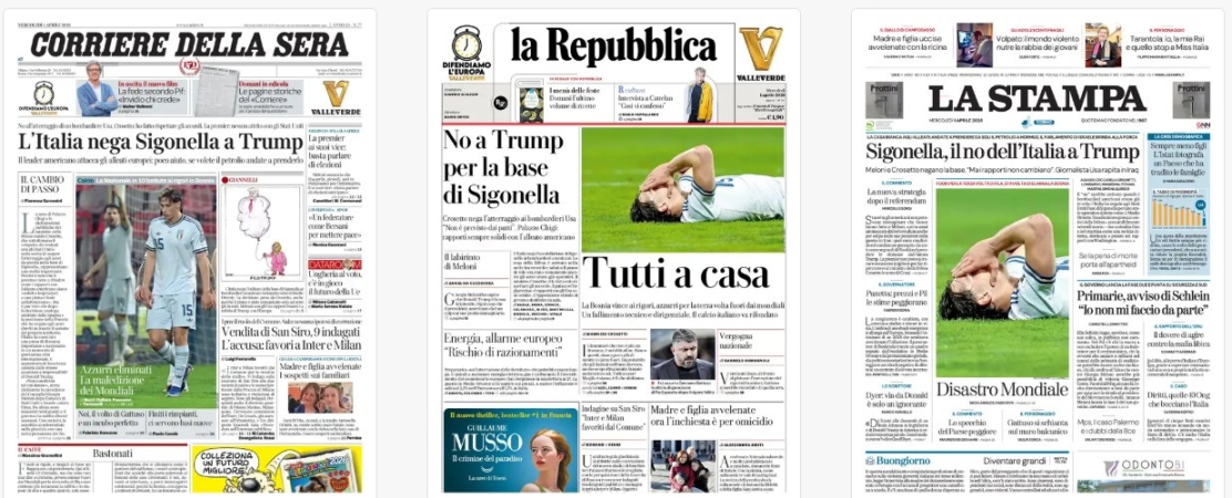 Titoli Corriere della Sera: L’Italia nega Sigonella a Trump la Repubblica: Tutti a casa La Stampa: Sigonella, il no dell’Italia a Trump Il Sole 24 Ore: Energia, l’Europa prepara l’austerity / Il caro greggio spinge l’inflazione: +1,7% Avvenire: Primo no a Trump Il Messaggero: Adesso tutti a casa Il Giornale: No a Trump / Lo stop italiano / su Sigonella /spiazza la sinistra Leggo: Fuori dal mondo Qn: La Sigonella di Crosetto / No ai bombardamenti Usa Il Fatto: Il governo smentisce / di averne azzeccata una Libero: Conte a tavola con l’amico di Trump La Verità: Sinistra presa con le mani nel sacco Il Mattino: Sprofondo Italia il Quotidiano del Sud: Sigonella chiusa agli F-15 / Da Meloni altolà a Trump il manifesto: Livello base Domani: Sigonella, il gran rifiuto di Meloni / Ma la mossa anti Trump è un bluff