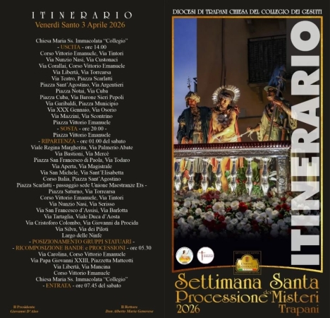 Trapani si prepara alla sua processione più lunga, più sentita e più complessa da gestire. Venerdì 3 aprile tornano i Misteri, con uscita dalla chiesa del Collegio alle 14 e rientro previsto sabato 4 aprile intorno alle 7.45.