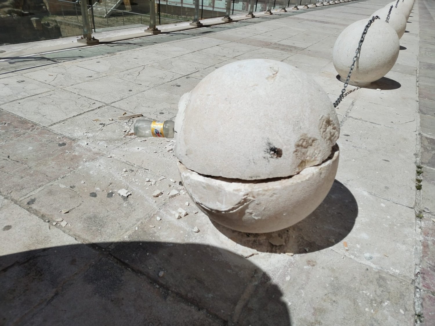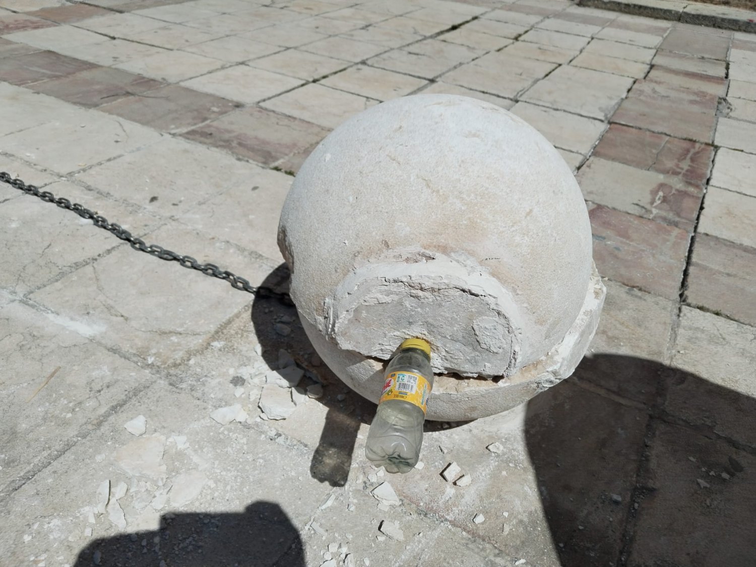 Oggi, Pasquetta 2026, la situazione si ripresenta identica. Una sfera si è staccata dalla base in cemento ed è finita dall’altro lato della strada, pur restando agganciata alla catena. Un’altra, come si vede anche dalle foto che vi alleghiamo è completamente rotta. E non manca neppure il tocco di qualche “buontempone”, che ha pensato di completare l’opera inserendo una bottiglia di plastica tra le due metà della sfera, quasi fosse un’installazione artistica.