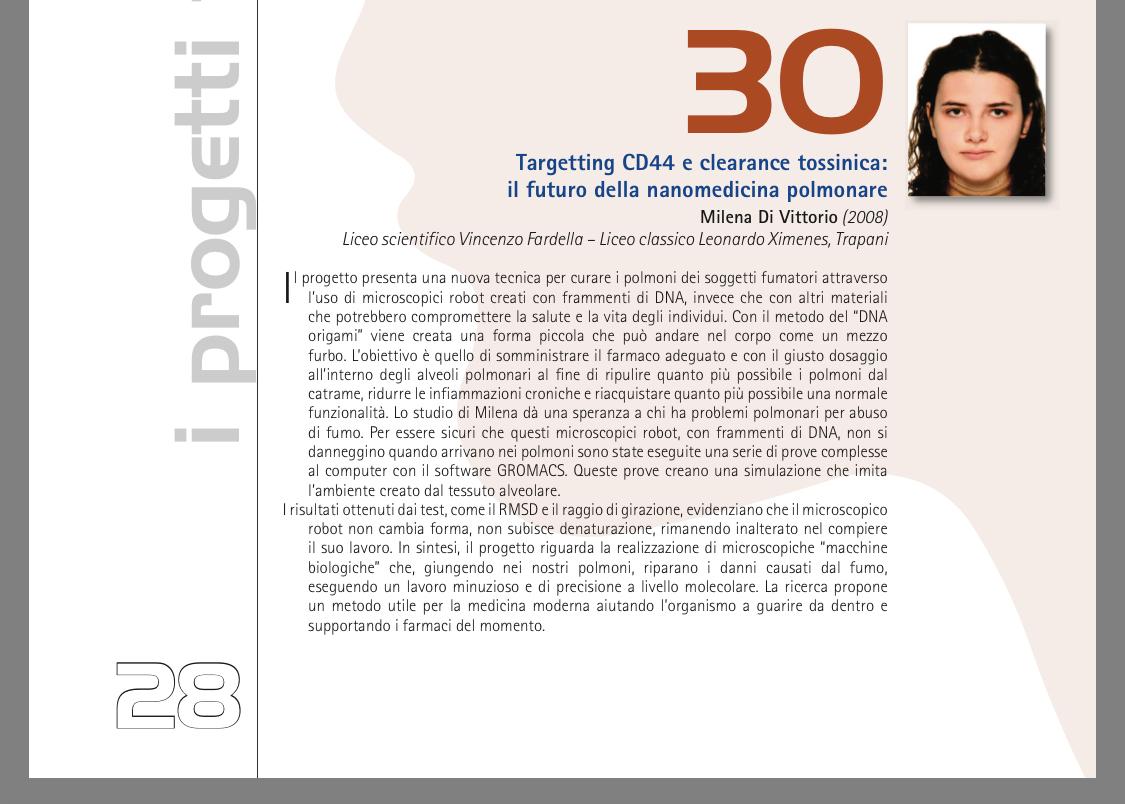 Milena è entrata tra i 40 finalisti del concorso nazionale “I giovani e le scienze”, promosso dalla Federazione delle associazioni scientifiche e tecniche per valorizzare studenti capaci di muoversi nel mondo della ricerca con idee originali, metodo scientifico e capacità espositiva. I finalisti si sono confrontati a Milano, nella sede della FAST, dal 21 al 23 marzo, presentando i propri lavori alla giuria e al pubblico.