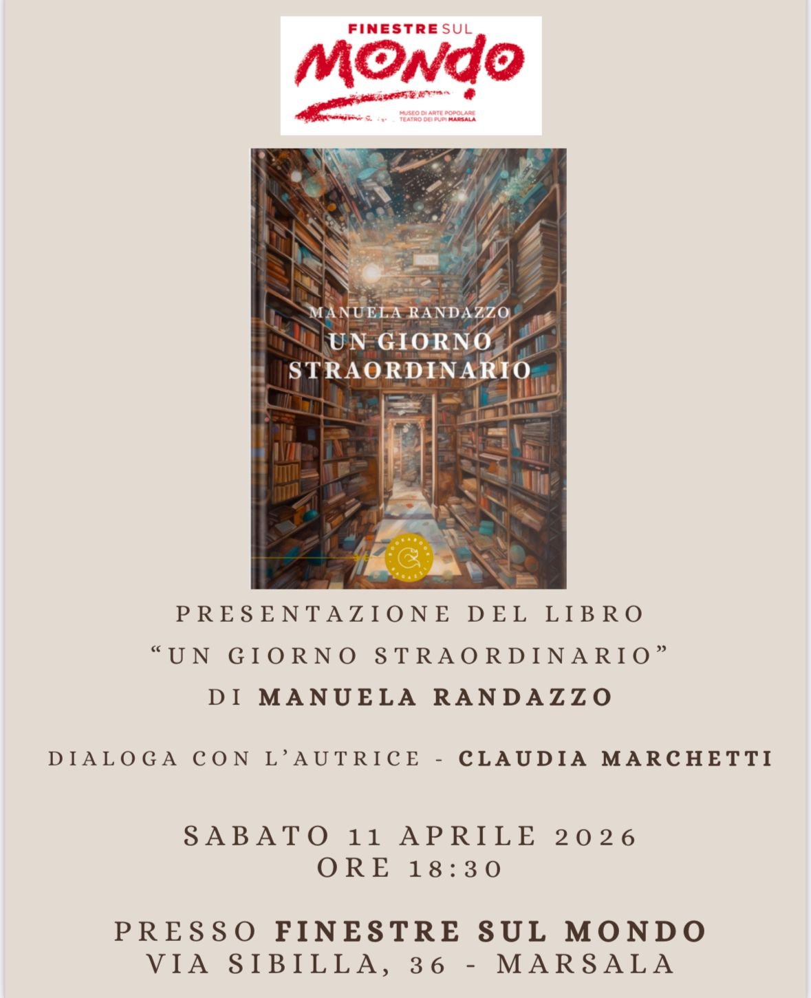 Un pomeriggio dedicato alla lettura e all’immaginazione. Sabato 11 aprile, alle ore 18.30, negli spazi dell’associazione “Finestre sul Mondo”, in via Sibilla 36 a Marsala, sarà presentato il romanzo “Un giorno straordinario” di Manuela Randazzo.