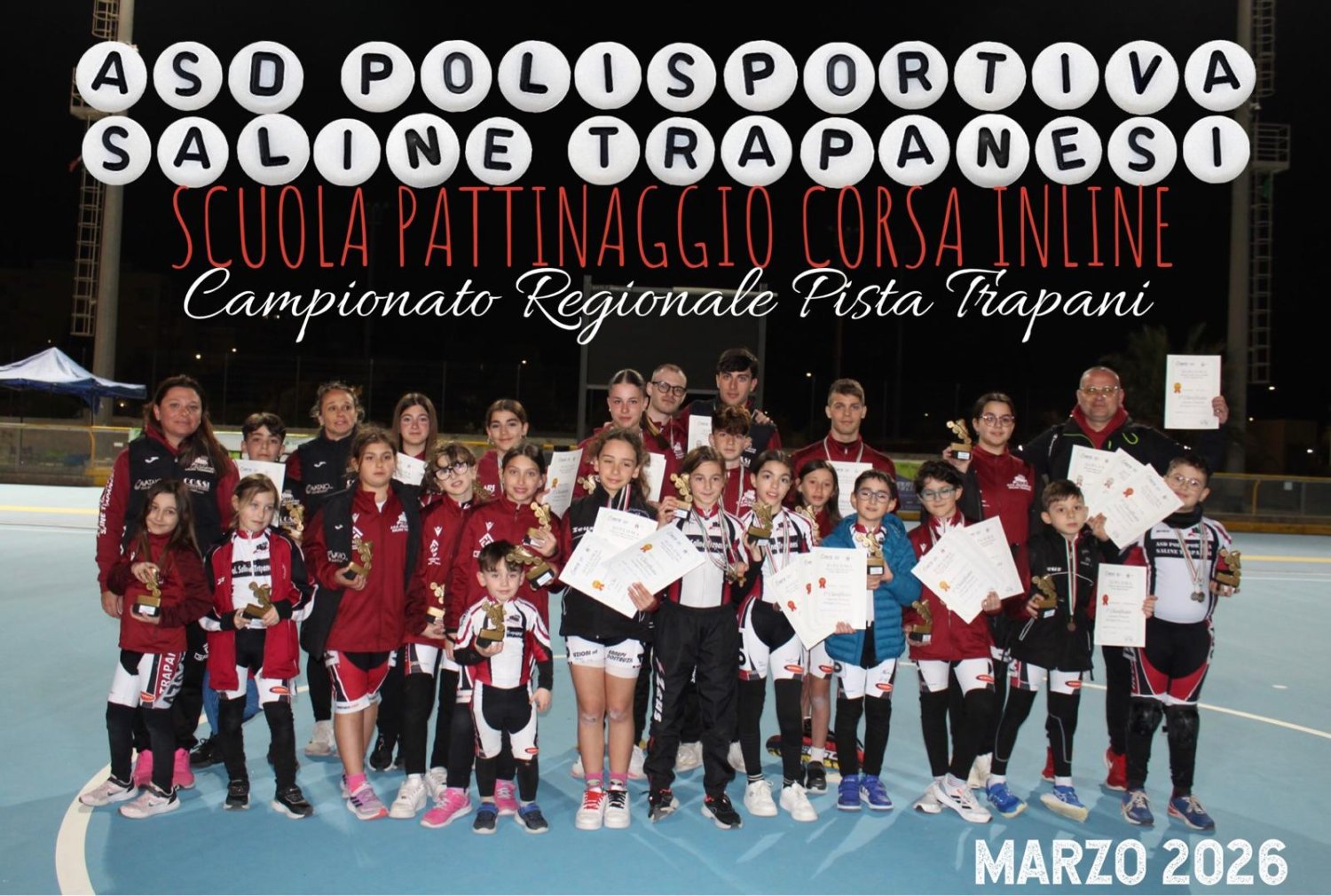 Il 28 ed il 29 Marzo 2026 il Pattinodromo Comunale di Trapani è stato teatro del Campionato Regionale di Pattinaggio Corsa su Pista, dove l'elite dei rotellisti Siciliani si sono contesi le qualifiche al Campionato Italiano Pista 2026. L'A.S.D. Polisportiva Saline Trapanesi capitanata dai Coach Valentina Incandela, Giuseppe Strazzera e Susanna Incandela, ha raccolto un grande bottino, ricco di soddisfazione e gioia per l'approccio alle gare mostrato dai propri grandi e piccoli atleti. Dopo una buona preparazione del settore agonismo i risultati ottenuti sono stati evidenti, oltre chè per le classifiche anche per il pubblico che ha assistito con grande entusiasmo le gare.