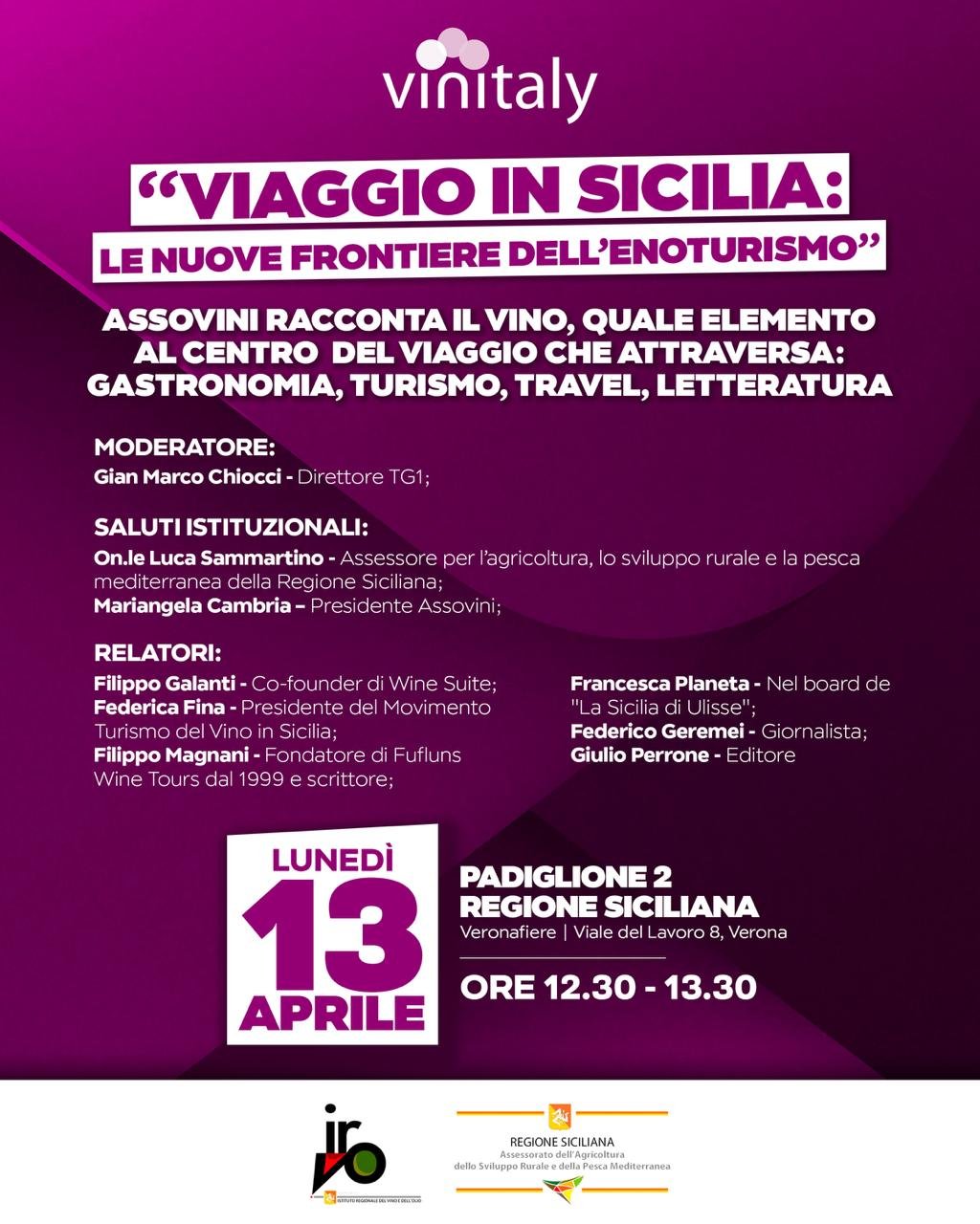 Lunedì 13 aprile, alle 11.45, spazio a un’intervista allo stesso Sammartino moderata dal direttore del TG1 Gian Marco Chiocci. A seguire, alle 12.30, il panel “Viaggio in Sicilia: le nuove frontiere dell’enoturismo”, con i saluti istituzionali di Sammartino e di Mariangela Cambria, e gli interventi di esperti e operatori del settore, tra cui Francesca Planeta.