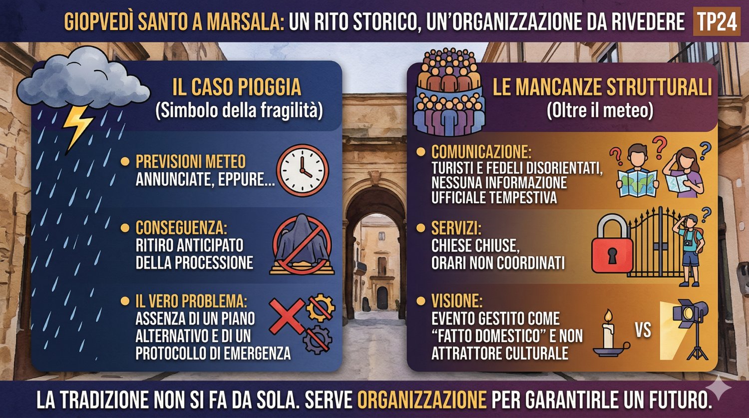 La processione del Giovedì Santo a Marsala è un patrimonio culturale e religioso che affonda le sue radici nei secoli. I gruppi sacri, le confraternite, i simulacri portati a spalla, le marce funebri: tutto contribuisce a creare un racconto potente, riconoscibile, autentico. Ma proprio per questo, oggi, non può più essere gestita come un evento minore, quasi domestico.