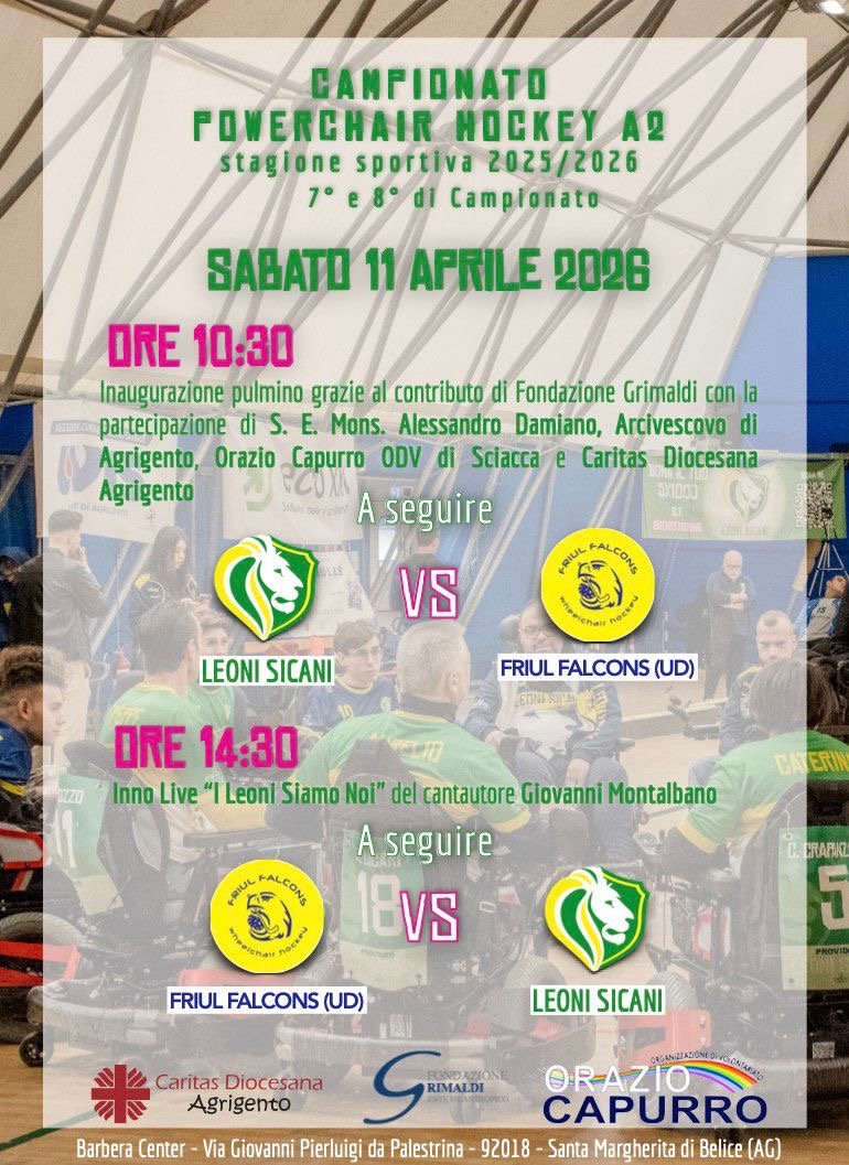 Sabato 11 aprile 2026, il Barbera Center di Santa Margherita di Belice si prepara a ospitare un appuntamento cruciale per il Campionato Nazionale di Powerchair Hockey serie A2 (stagione sportiva 2025/2026). I padroni di casa dei Leoni Sicani scenderanno in campo per una doppia ed entusiasmante sfida valida per la 7ª e 8ª giornata di campionato, affrontando la formazione dei Friul Falcons di Udine. La doppia sfida contro i friulani sarà un crocevia fondamentale per la stagione agonistica.