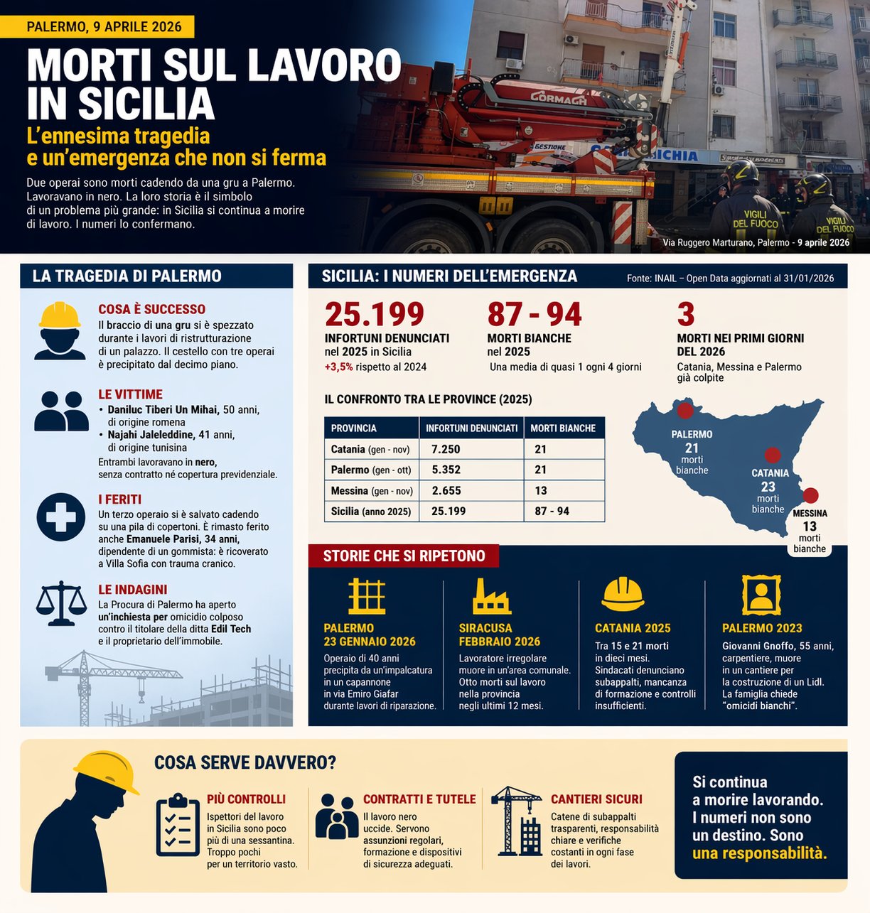 Ancora una caduta, ancora un cantiere, ancora due vite spezzate. A Palermo, il 10 aprile 2026, Daniluc Tiberi e Najahi Jaleleddine sono morti precipitando da una gru. Non è solo cronaca. È l’ennesimo tassello di una lunga scia che in Sicilia continua a crescere.