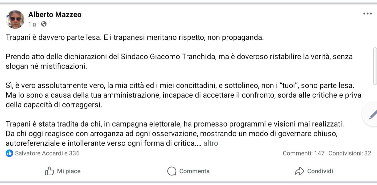 Da qui ha preso avvio un duro botta e risposta che si consuma sempre più frequentemente sui social. Il sindaco insiste sull’incoerenza politica di Mazzeo, mentre quest’ultimo respinge le accuse, denunciando un clima avvelenato e attacchi personali che travalicano il confronto istituzionale.