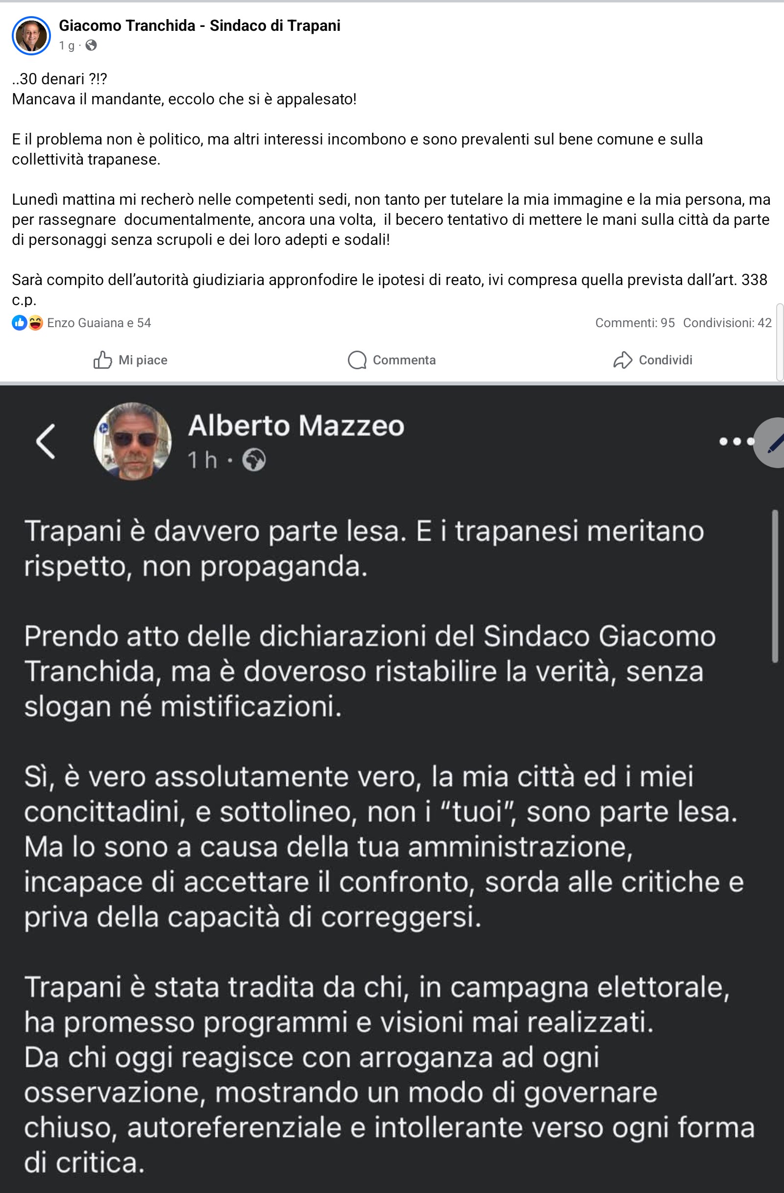 In quell’occasione il sindaco ha utilizzato toni durissimi, arrivando a definire alcuni esponenti critici, tra cui il presidente del Consiglio comunale Alberto Mazzeo, come “novelli Giuda”, accusandoli di aver prima condiviso e votato gli atti amministrativi legati al progetto e poi di averli rinnegati per convenienza politica.
