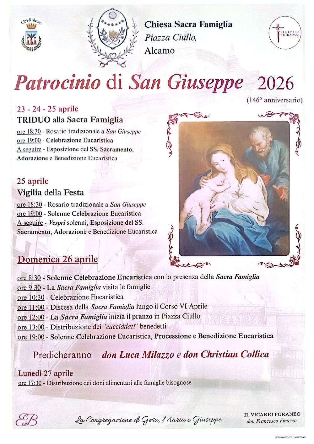 FTorna ad Alcamo la Festa del Patrocinio di San Giuseppe, conosciuta in dialetto come “u patrucinio”, una delle più antiche e sentite tradizioni religiose della città, le cui origini risalgono al 1880. La celebrazione, che si svolge ogni anno nella terza domenica dopo Pasqua, è dedicata alla Sacra Famiglia e rinnova un rito profondamente radicato nella devozione popolare alcamese. Per l’edizione 2026, i festeggiamenti si terranno dal 23 al 26 aprile con il patrocinio del Comune di Alcamo.