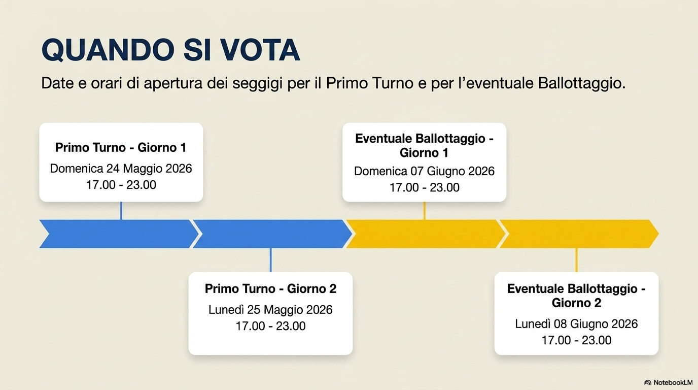 L'eventuale turno di ballottaggio è fissato per: Domenica 7 giugno (07:00-23:00) e lunedì 8 giugno 2026 (07:00-15:00).